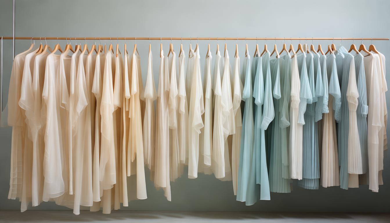 乔其纱和双皱面料制成的服装不宜长时间悬挂,因为其自身重量会导致衣物越拉越长,进而造成变形。存放时,应在衣物下面垫上布料,并将它们放置在箱柜的上层,以防止衣物被压出皱纹。