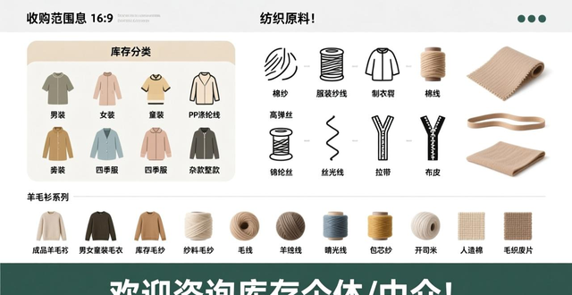 公司主要的收购范围是,库存服装这一块,其中涵盖男装,女装,童装,各类春夏秋冬四季服,杂款的,整款的;纺织原料方面有各种规格的棉纱,服装纱线,制衣线,PP涤纶线,高弹丝,棉线,锦纶丝,丝光线,拉链,织带,布匹等;羊毛衫系列包含成品羊毛衫,男女童装毛衣,各种规格的库存毛纱,纱线,毛料,棉纱,毛线,羊毛线,羊绒线,兔毛线,晴纶线,丝光棉,包芯纱,开司米,人造棉,毛织废片等情形 !有库存的行业个体们,中介们,欢迎来电咨询 !