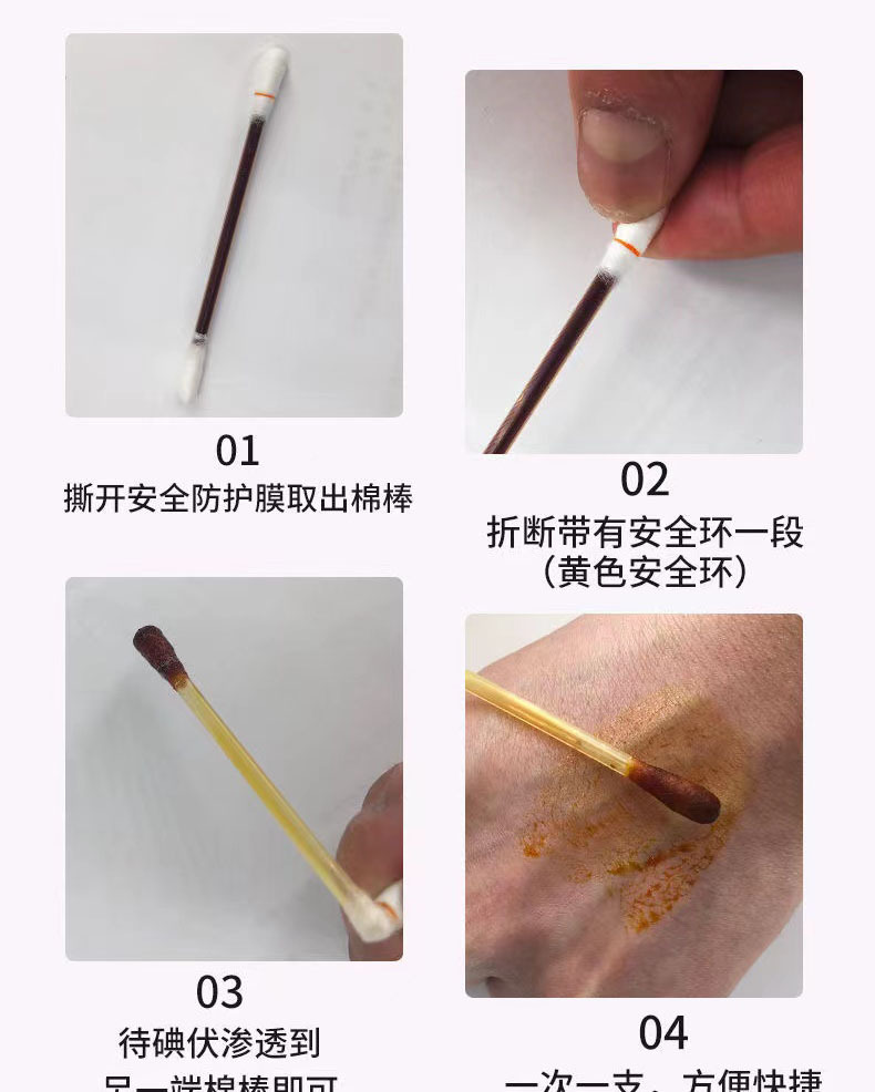 经常使用碘伏棉签时,将碘伏棉签彩环端折断,碘伏会在大气压和重力作用下压入另一端,而后涂抹在皮肤上即可应用碘伏启动消毒。